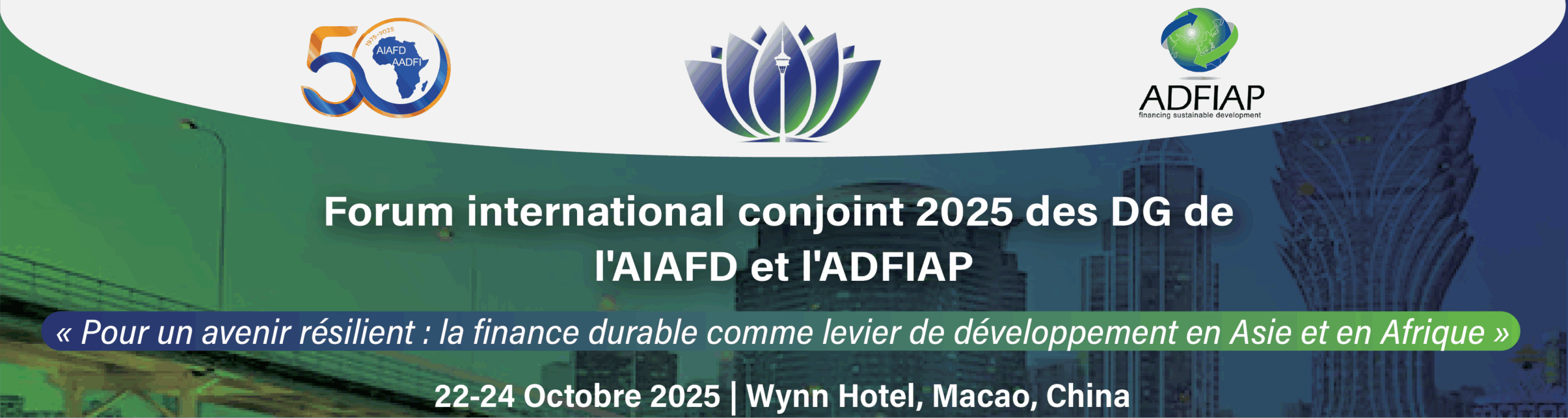 Le Forum international conjoint des DG de l'ADFIAP de l'AIAFD 2025 se tiendra du 22 au 24 octobre 2025 à l’hôtel Wynn Macau, à Macao, en Chine, sous le thème « Pour un avenir résilient : la finance durable comme levier de développement en Asie et en Afrique » Cet événement biennal, coorganisé par l’Association des institutions de financement du développement d’Asie et du Pacifique (ADFIAP) et l’Association des institutions africaines de financement du développement (AIAFD), réunira des DG et des cadres supérieurs d’Institutions de financement du développement (IFD), des décideurs politiques et des leaders du secteur afin de partager leurs perspectives et de renforcer la collaboration interrégionale. Le Forum vise à positionner les IFD à l’avant-garde du développement durable en mettant l’accent sur les investissements verts, la mobilisation de capitaux et la finance numérique comme moteurs clés d’une croissance inclusive et résiliente face au climat.